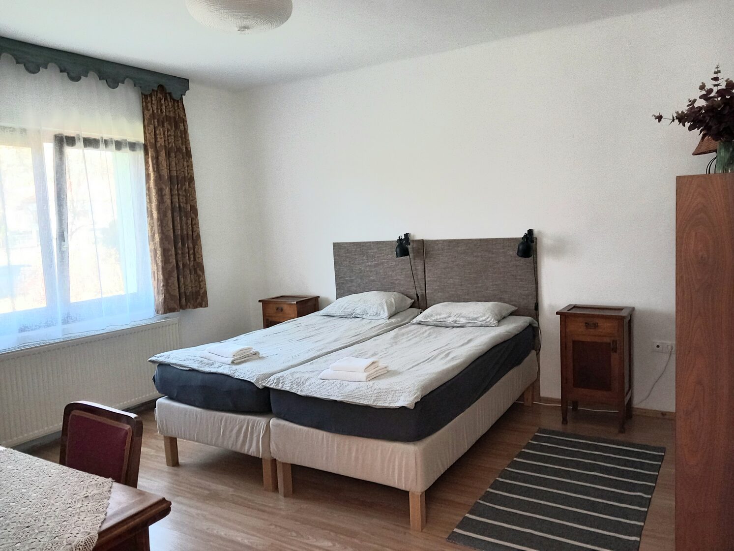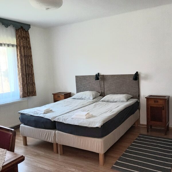 Tágas kétágyas szoba, ami a társalgóból nyílik. Ablaka az utca felé néz.